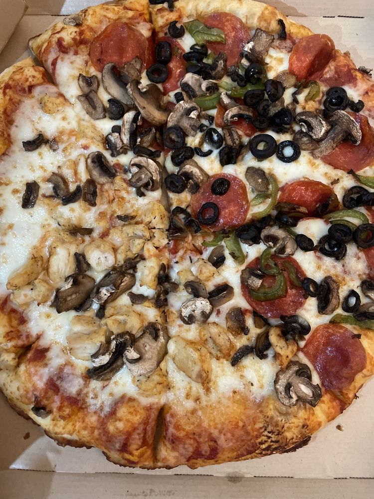 This loaded pizza is the perfect choice for family dinner or a lunch with your crew. Includes pepperoni, seasoned pork, beef, mushrooms, green bell peppers and onions.